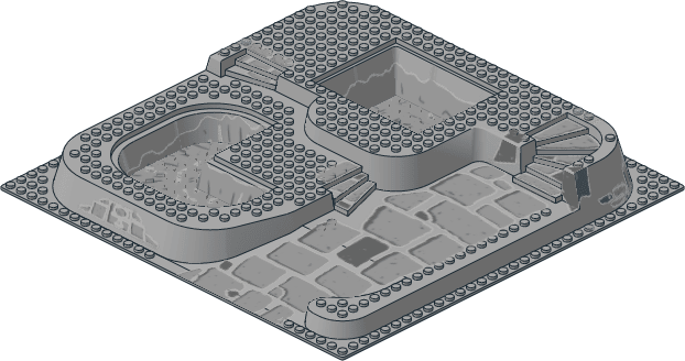6092p01.dat - Baseplate 32 x 32 Raised with Ramp, Pit and Stairs with Grey Stones Pattern