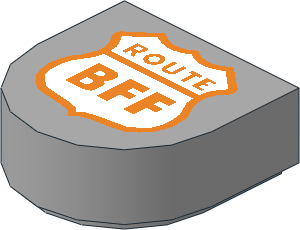 parts/24246pt0.dat - Tile 1 x 1 with Rounded End with White Highway Sign, Orange Outline and "ROUTE BFF" Pattern