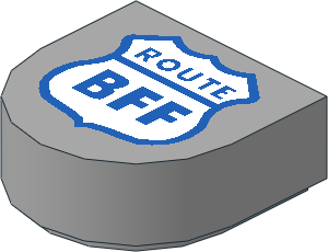 parts/24246pt1.dat - Tile 1 x 1 with Rounded End with White Highway Sign, Blue Outline and "ROUTE BFF" Pattern