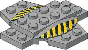 parts/30303pa0.dat - Plate 6 x 6 x 0.667 Cross with Dome and Black and Yellow Danger Stripes Pattern