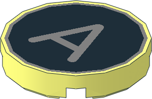 parts/14769pta.dat - Tile 2 x 2 Round with Metallic Silver "A" on Black Background Pattern