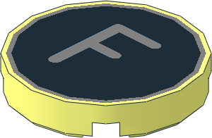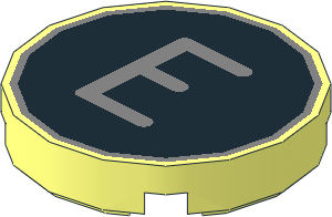 parts/14769ptf.dat - Tile 2 x 2 Round with Metallic Silver "F" on Black Background Pattern