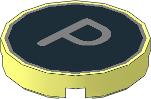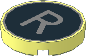 parts/14769ptr.dat - Tile 2 x 2 Round with Metallic Silver "R" on Black Background Pattern