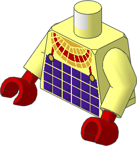 parts/76382pwb.dat - Minifig Torso with Arms and Hands with White/Blue Triangles, Red/White Amulet Pattern